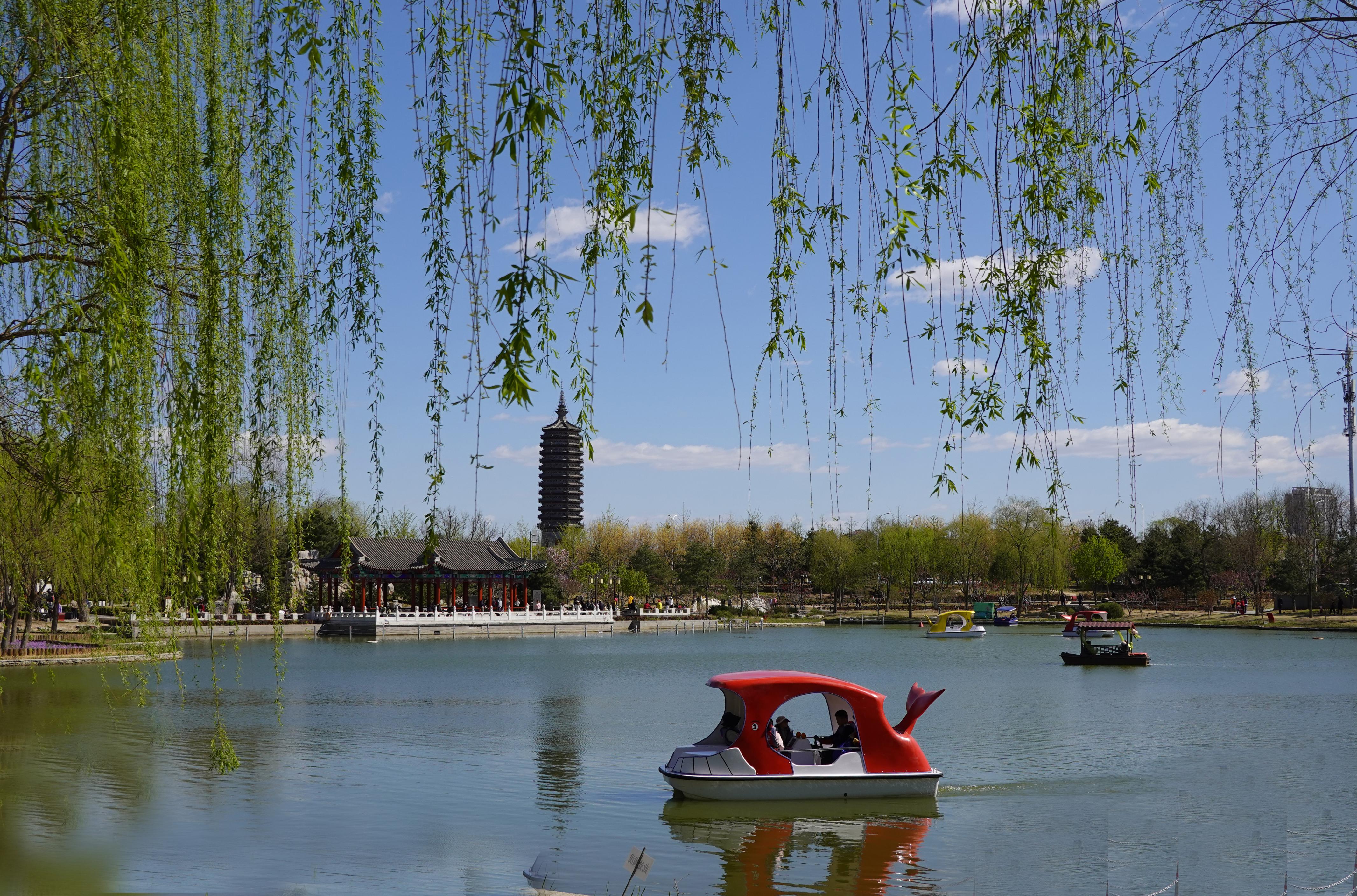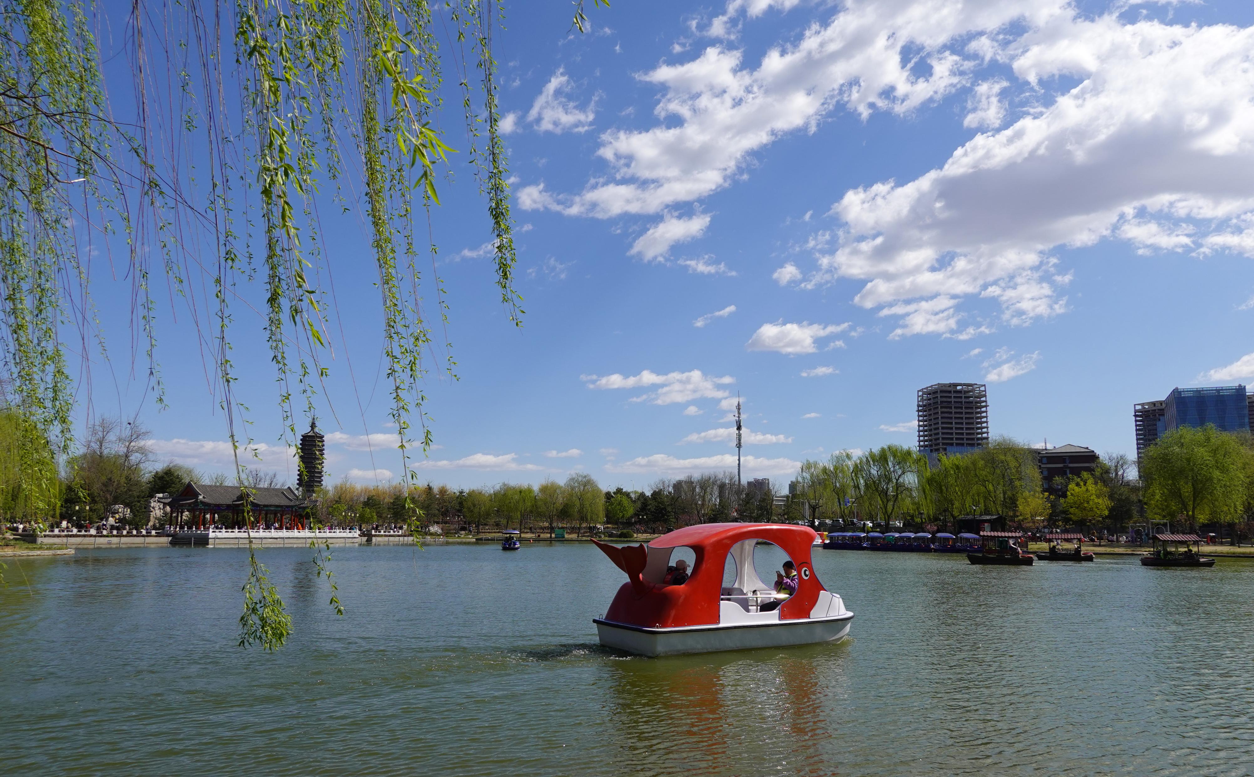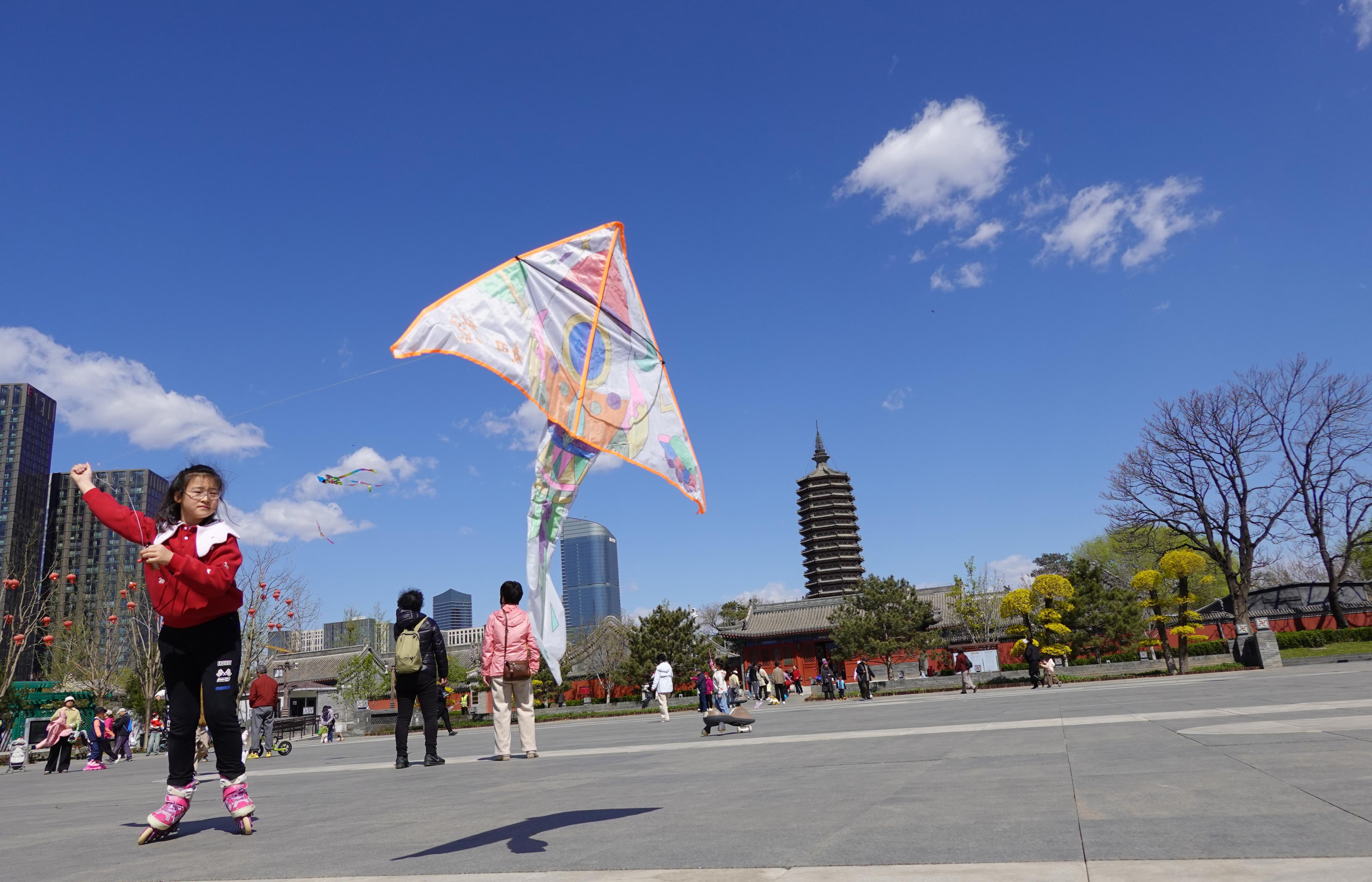 4月6日,清明假期最后一天,北京阳光明媚、春风和煦,市民在通州燃灯塔下泛舟湖上,纸鸢逐春。