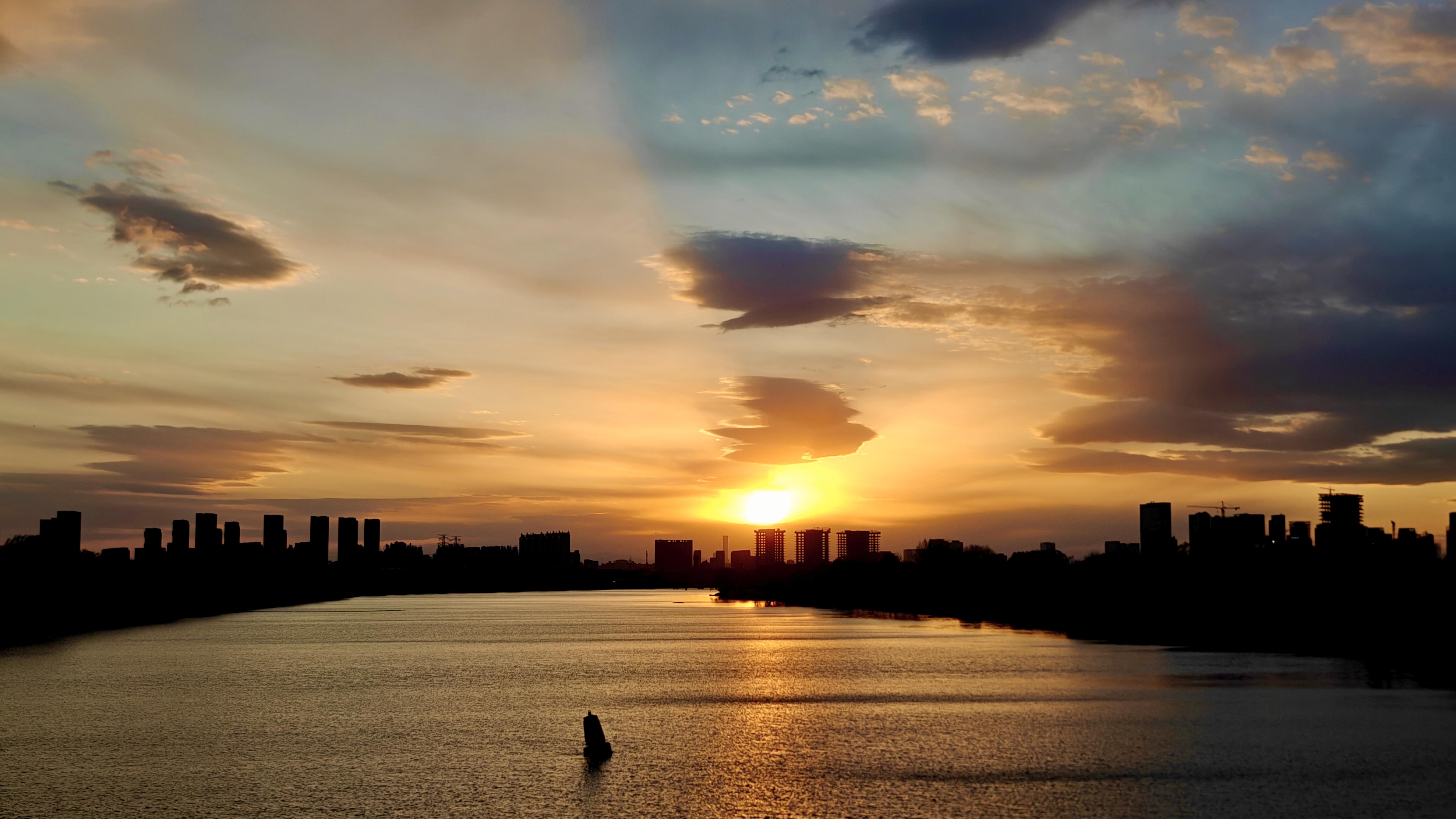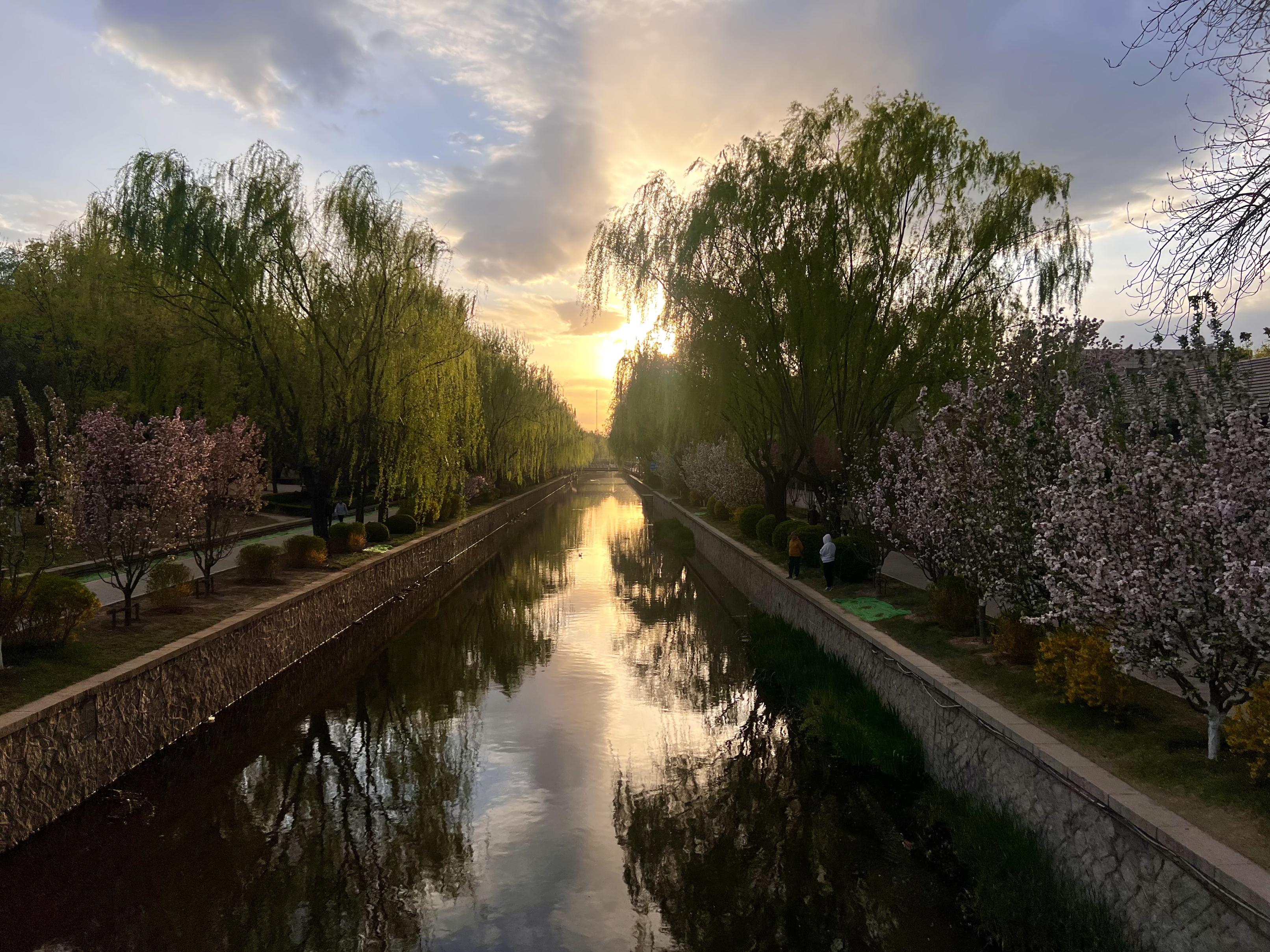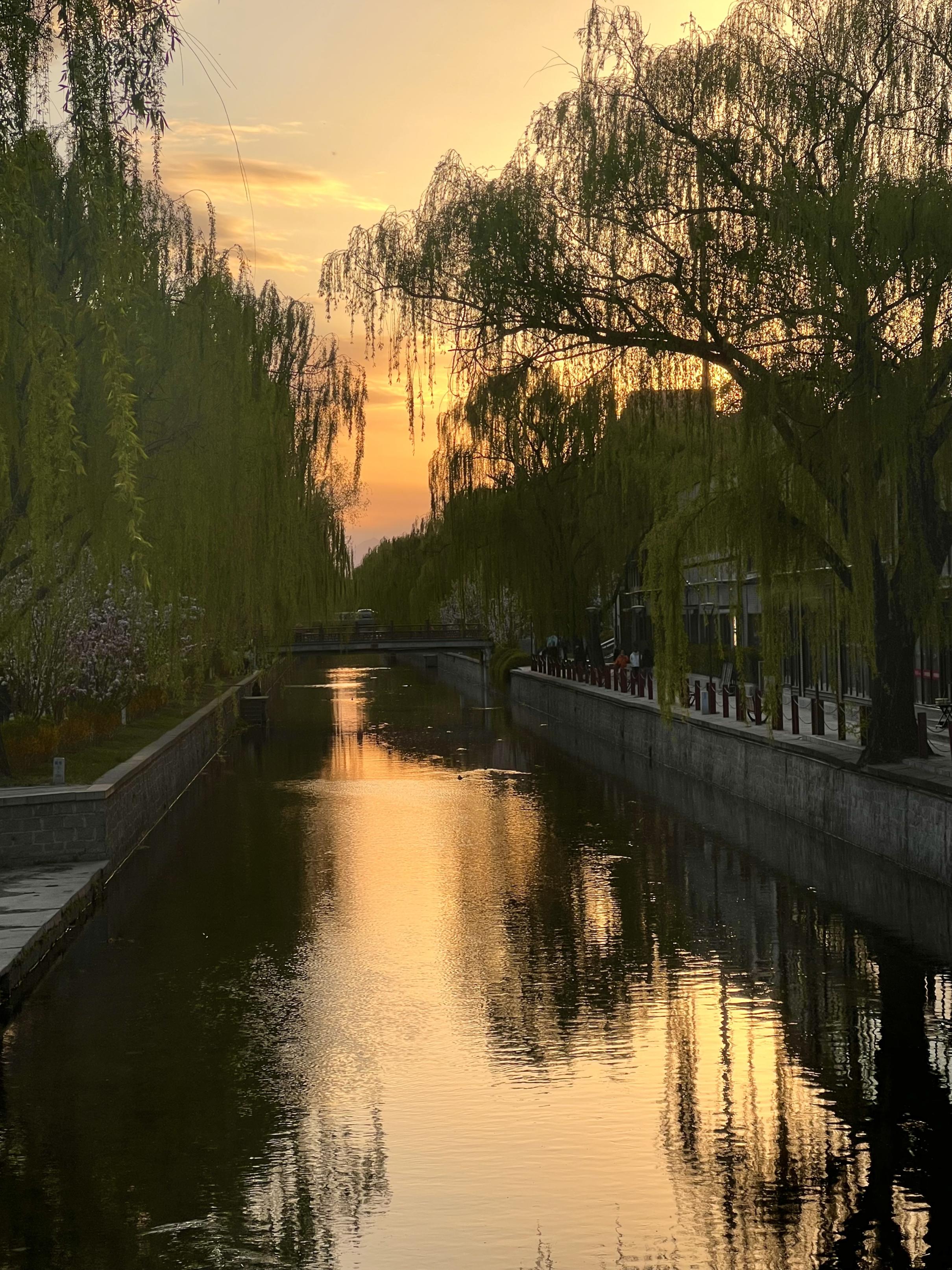 夕阳斜照,水面半江瑟瑟半江红,沿岸花枝蜿蜒。