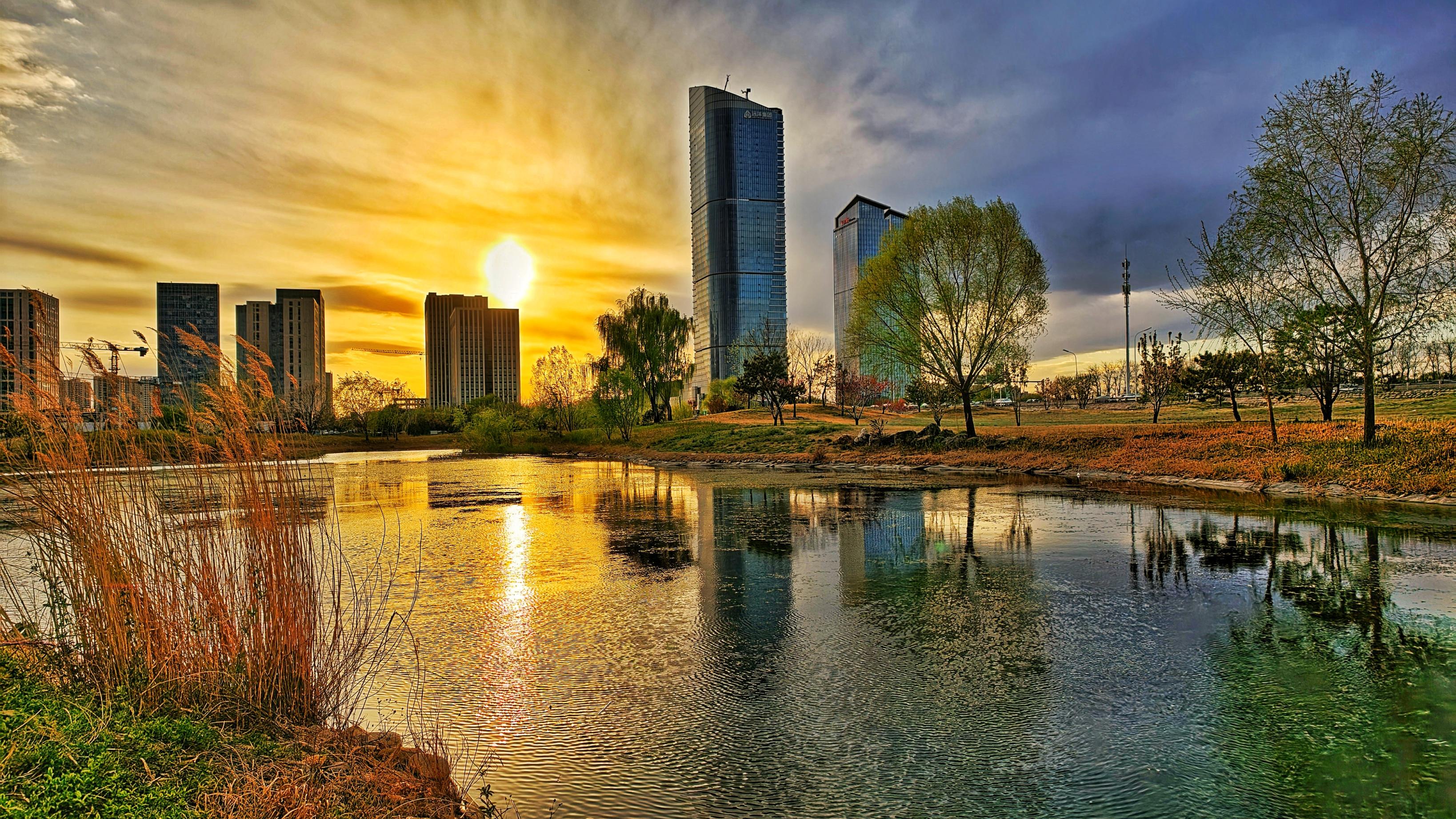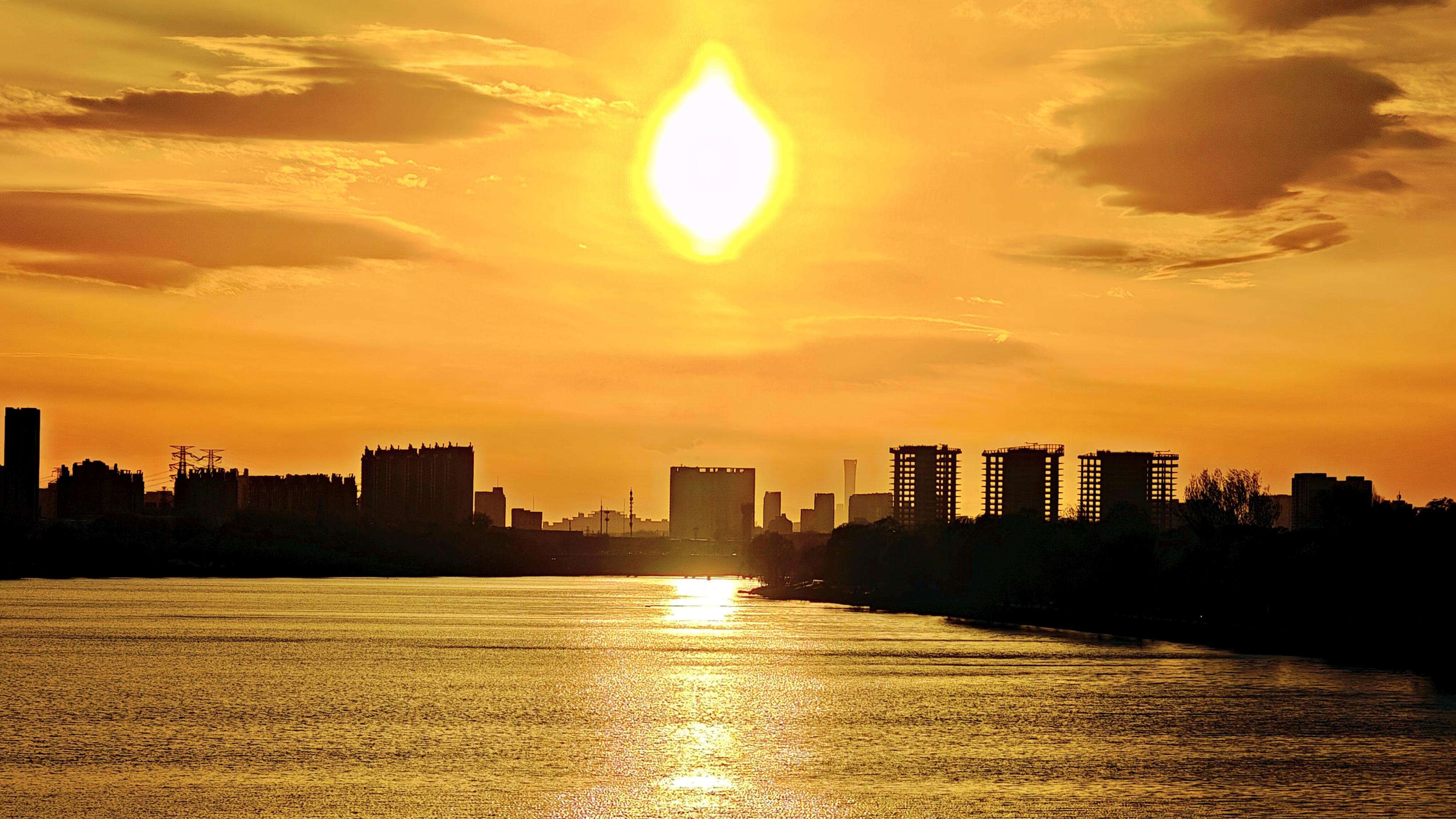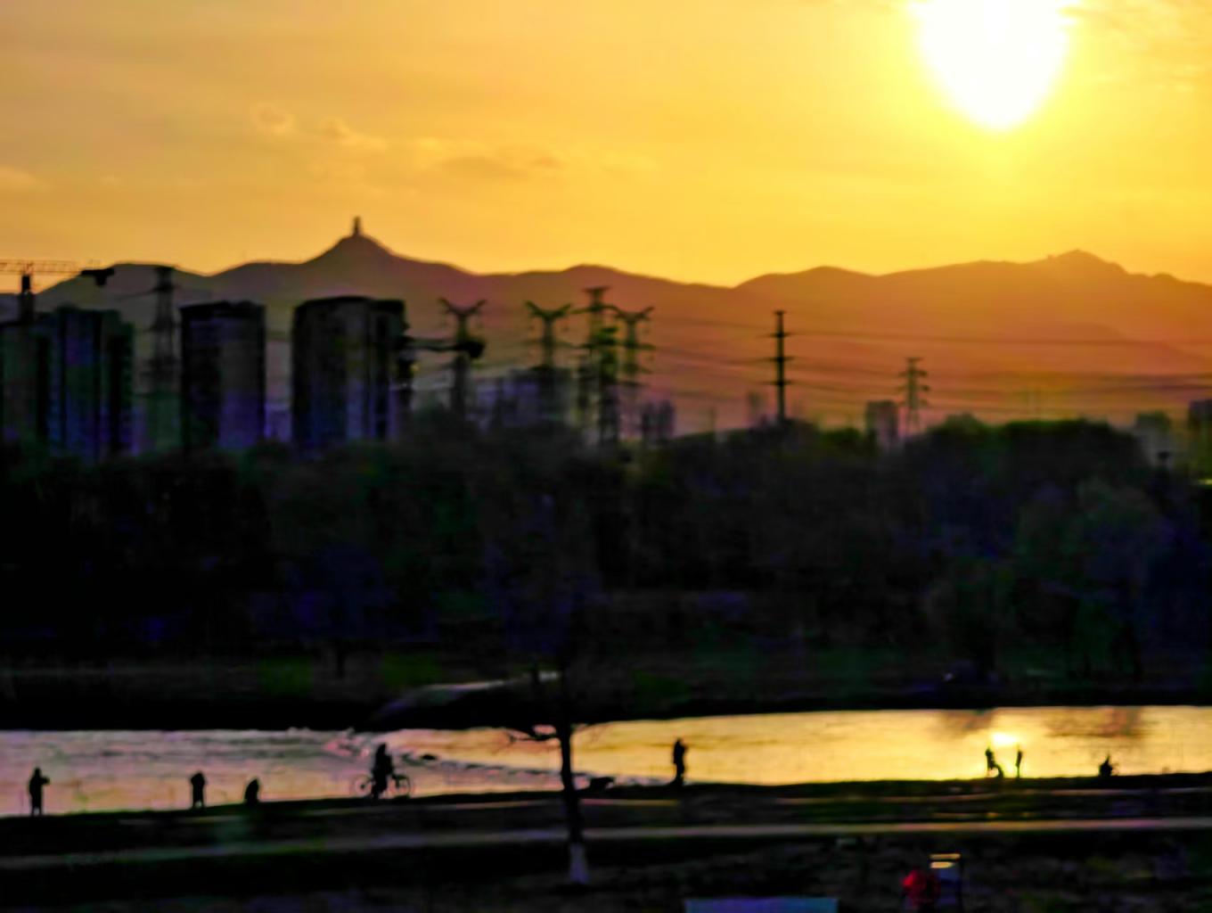 夕阳斜照,水面半江瑟瑟半江红,沿岸花枝蜿蜒。