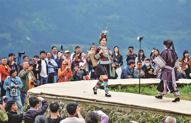 村民在2025年贵州省从江县加榜梯田“开秧门”暨首届加榜“T”田秀活动中进行梯田走秀。新华社记者 杨文斌摄