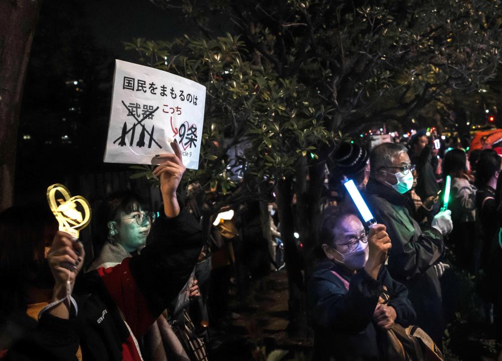 4月8日晚,大批日本民众在位于东京的国会议事堂前集会,抗议高市早苗政府部署远程导弹、企图解禁杀伤性武器出口等破坏和平宪法的动向。