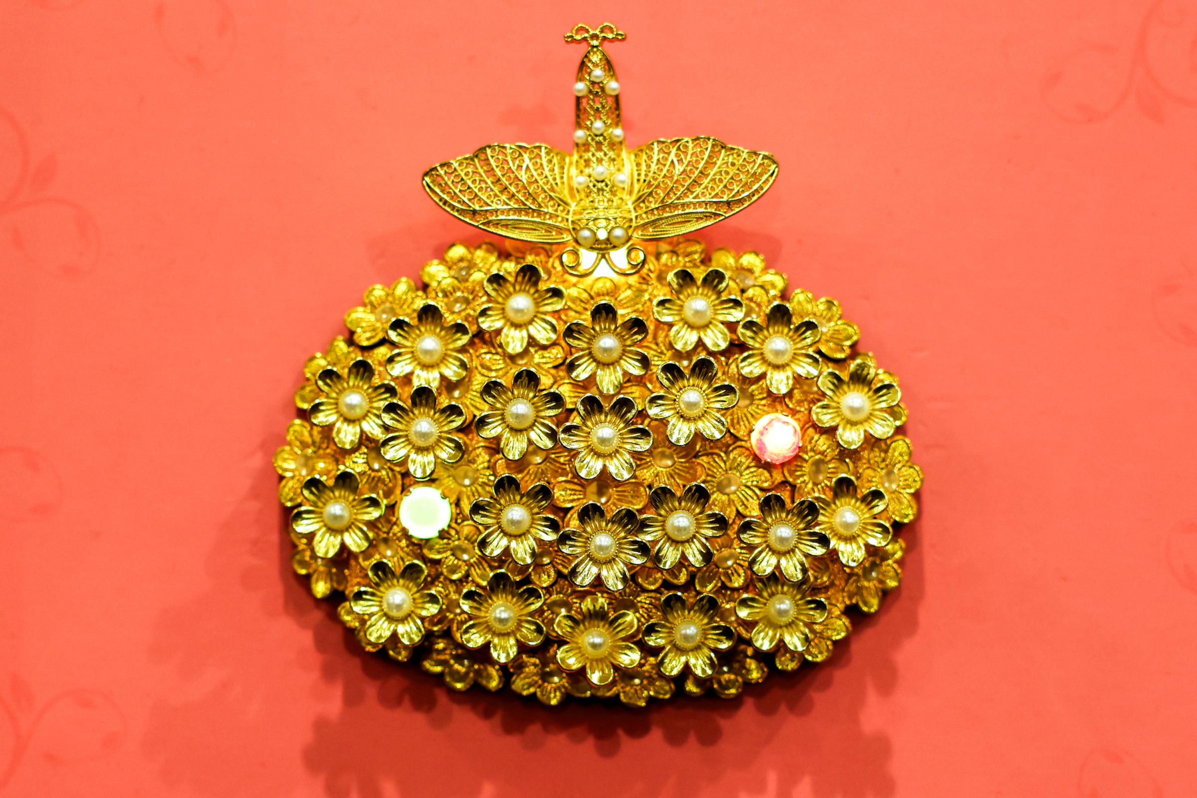 和冰箱贴一起打响知名度的,还有以李静训的嵌珍珠宝石金项链为原型设计的项链、耳饰、戒指等成套文创。各色宝石交相辉映,金球圆珠于耳畔摇曳生姿,细钻与金色映衬光芒四射,绚丽夺目。李静训的金手镯也被精巧还原——珍珠搭配绿松石清雅贵气,在金色的映衬下格外典雅。