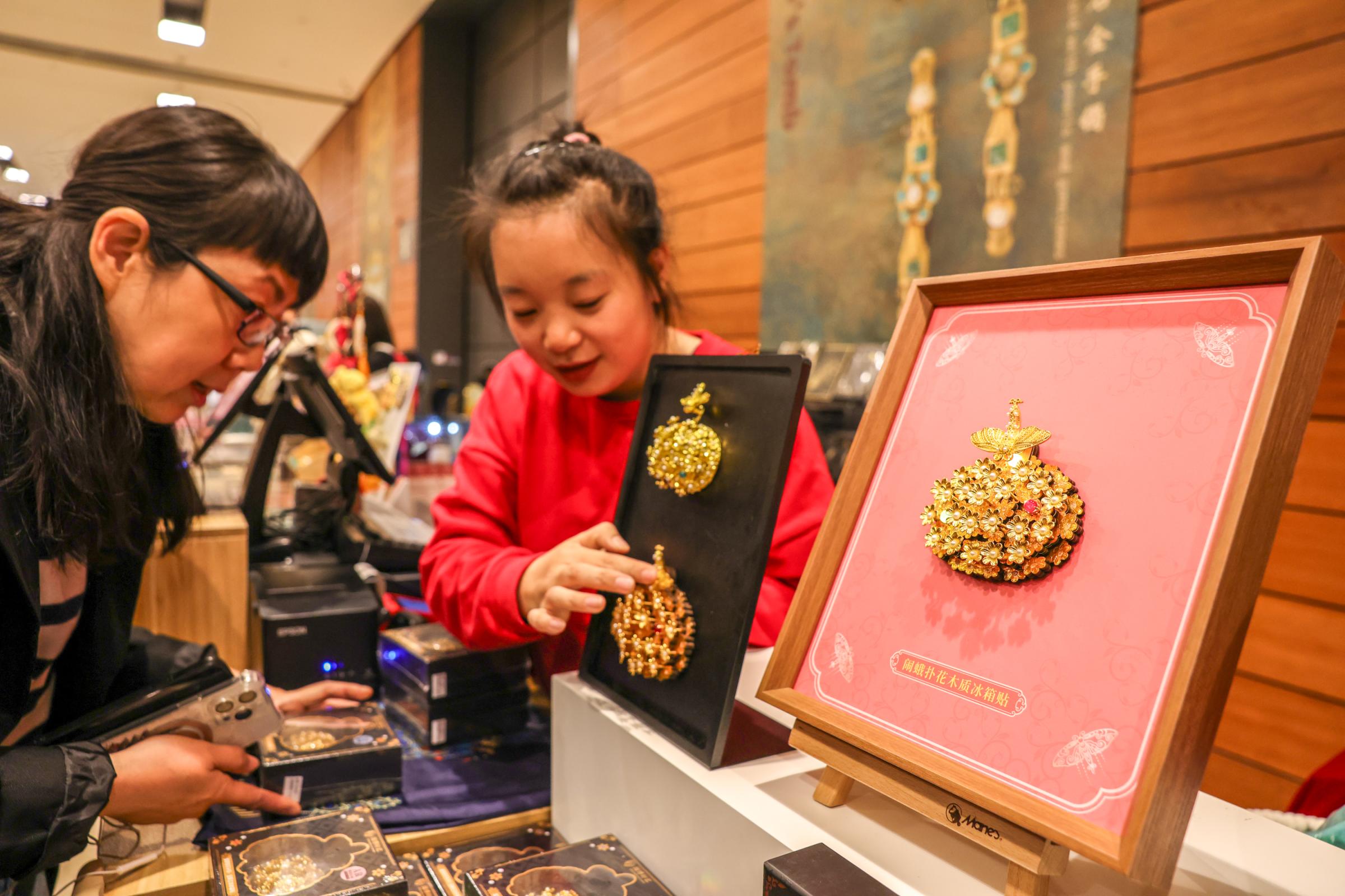 国博一层南侧,李静训系列文创展柜成了最新的打卡点,经常吸引观众驻足拍照。国博(北京)文化产业发展有限公司负责人廖飞介绍,目前卖得最火的是两款闹蛾金钗冰箱贴。木质款冰箱贴轻拍可点亮钗上的“宝石”;金属款冰箱贴主打“一贴三用”,不仅可体验AR“戴钗”,还可搭配附带的发梳秒变头饰,冠上的金蛾也能自由拆卸为徽章佩戴。