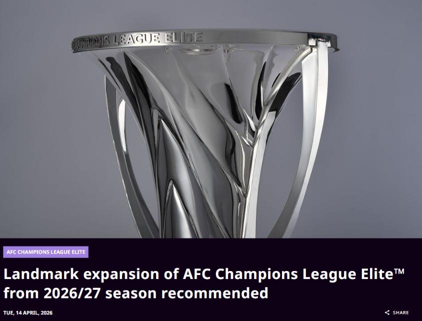 4月14日,亚足联官方发布公告,从2026/27赛季开始,亚冠精英联赛拟扩军至32队。东亚、西亚区各16队,并设置淘汰赛附加赛。