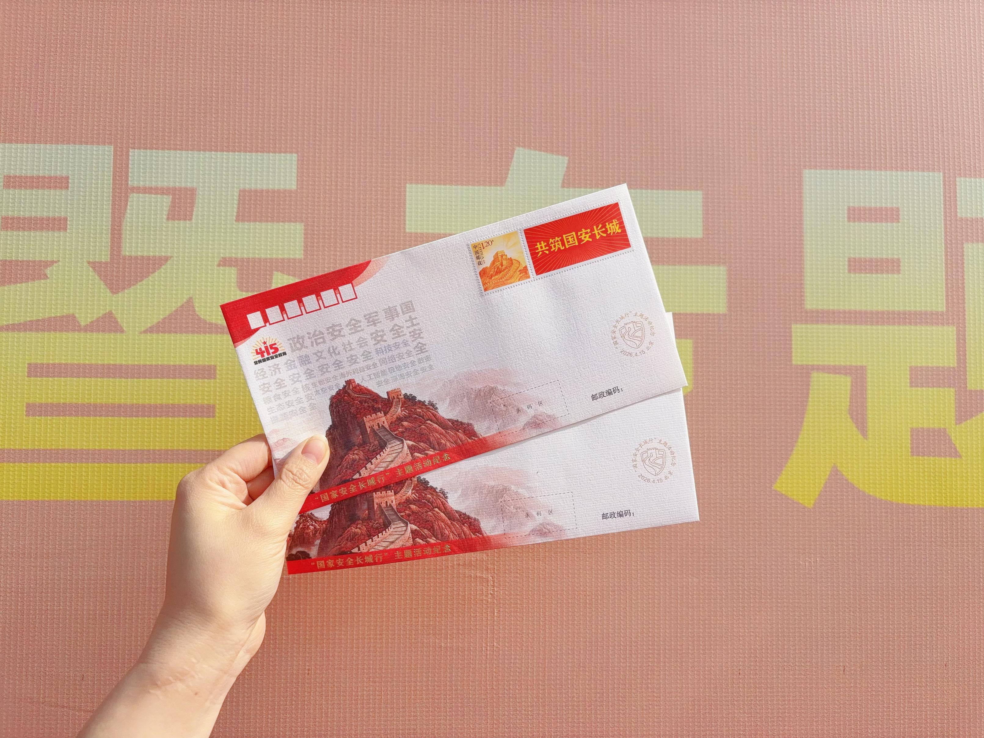 今天是第十一个全民国家安全教育日,在北京八达岭长城脚下,“国家安全长城行”活动举办,主题活动纪念封也同步发布。这款纪念封在设计中运用了荧光油墨工艺。当设计师用紫外线灯照亮纪念封时,素净的封面上20个国家安全领域关键词霎时显现多彩荧光,每一个关键词犹如古老的城墙砖,错落嵌入长城山峦轮廓,构筑起坚不可摧的国家安全长城。
