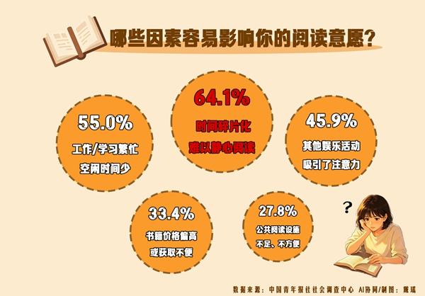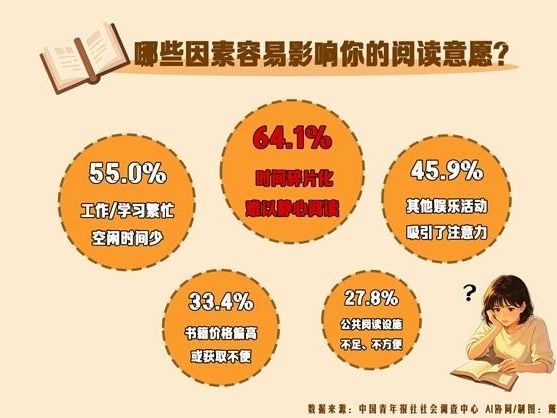 哪些因素容易影响大家的阅读意愿?调查中,64.1%的受访者认为是时间碎片化,难以静心阅读;55.0%的受访者因为工作或学习繁忙,空闲时间少;45.9%的受访者被其他娱乐活动吸引了注意力。其他还有:书籍价格偏高或获取不便(33.4%)、公共阅读设施不足、不方便(27.8%)、周围的阅读氛围不浓(18.3%)。