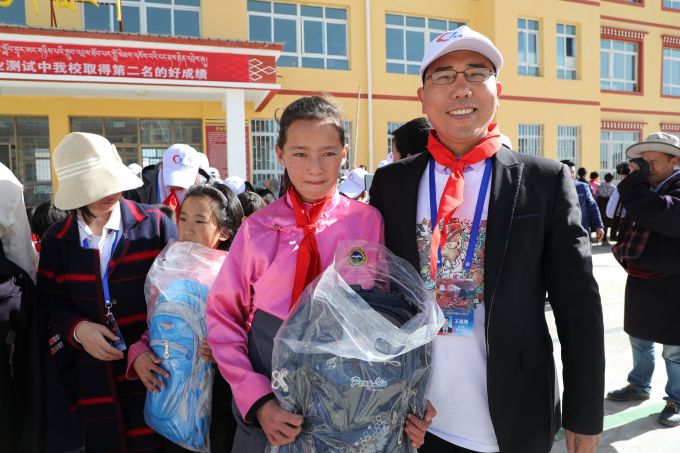 7月11日,王现海与随行团队专家到玛曲县第一小学参加学生们的毕业典礼,并向学生代表送上学习用品。