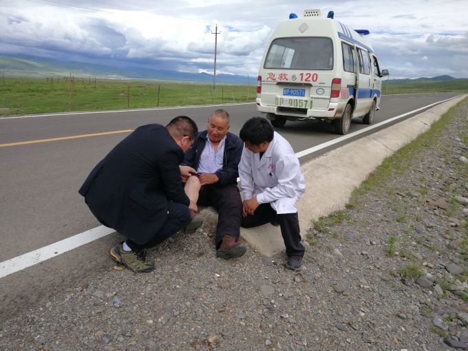 一位老人挥舞着拐杖拦下了在公路上飞驰的120救护车,本以为是他的家人需要救助,下车后了解到老人得知北京的医务专家来欧拉秀玛乡义诊,本想赶到到卫生院去看病,但路程较远又没有交通工具,但听其他义诊回来的藏民说,下午专家们要到贡周看望成功手术的先心病患者会路过这里,老人就站在路边等待着专家们的到来。