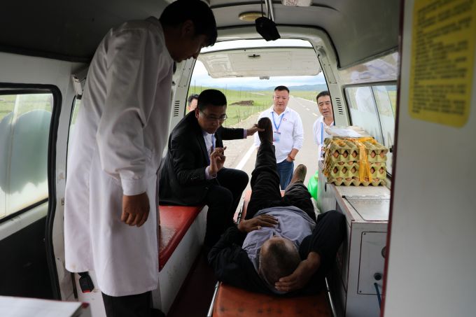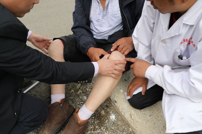 老人说自己的膝关节总是会疼,刚才在路边站了一个多小时,肿胀疼痛更加严重,看到老人需要医治,来自北京市昌平区医院的骨科主任王现海立即在公路边开始了给老人的义诊。他让老人坐在公路边,经过询问病史及进行体格检查后,诊断为:右膝关节骨性关节炎。随后与欧拉秀玛乡卫生院院长杨河军及其他一起的北京专家将老人抬上救护车,让他躺在救护车的担架上,进行了腰椎及髋关节的体格检查,除外了腰椎及髋部疾患。然后他辅导老人进行针对膝关节骨性关节炎的康复锻炼,建议其口服消炎止痛类药物,并到上级医院进一步检查明确病情。老人愉快的接受了建议,连忙称谢。