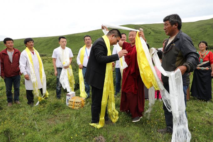 穿过一跳条小溪来到山腰处才让的家,全家人看到从山下走来的慰问团队就一直挥手,用最隆重的方式向每个人敬献哈达,王现海与延庆区延庆镇社区卫生服务中心院长史武军、延庆区康庄镇社区卫生服务中心院长万爱民分别向才让拉毛各捐赠助学金1000元。临行前才让家人又向专家团队成员送上当地的酥油和糌粑。