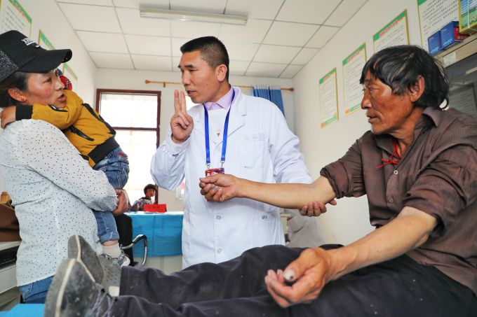 图为王现海在欧拉秀玛乡卫生院为藏族同胞义诊。