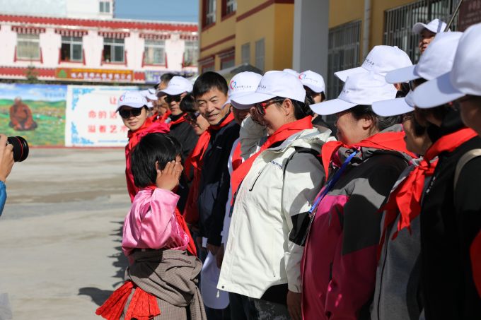 图为玛曲县第一小学学生为专家佩戴红领巾。
