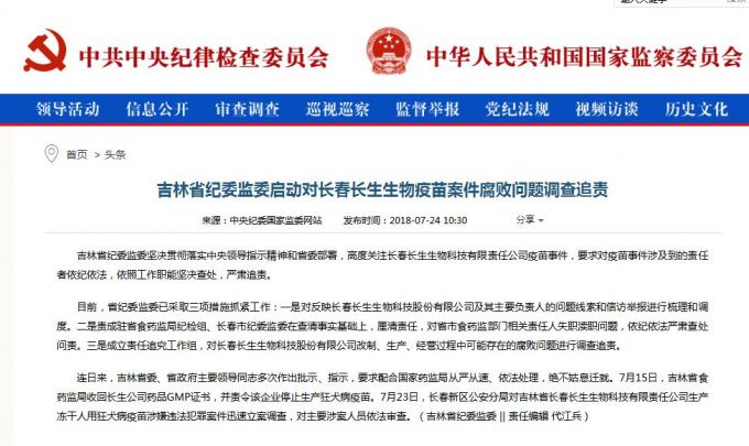 吉林省纪委监委启动对疫苗案件腐败问题调查追责