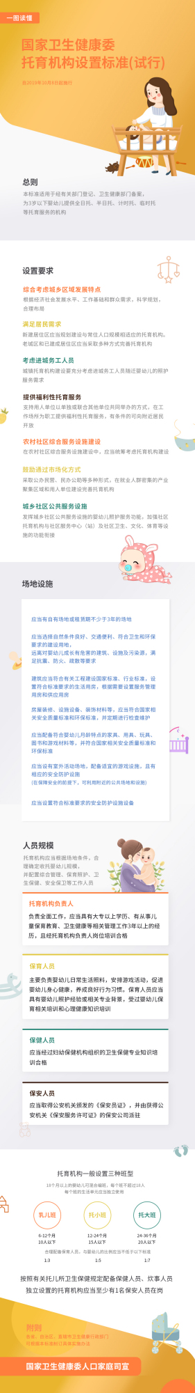 该标准主要适用于经有关部门登记、卫生健康部门备案,为3岁以下婴幼儿提供全日托、半日托、计时托、临时托等托育服务的机构。设置要求中明确“支持用人单位以单独或联合其他单位共同举办的方式,在工作场所为职工提供福利性托育服务,有条件的可向附近居民开放。”“鼓励通过市场化方式,采取公办民营、民办公助等多种形式,在就业人群密集的产业聚集区域和用人单位建设完善托育机构。”