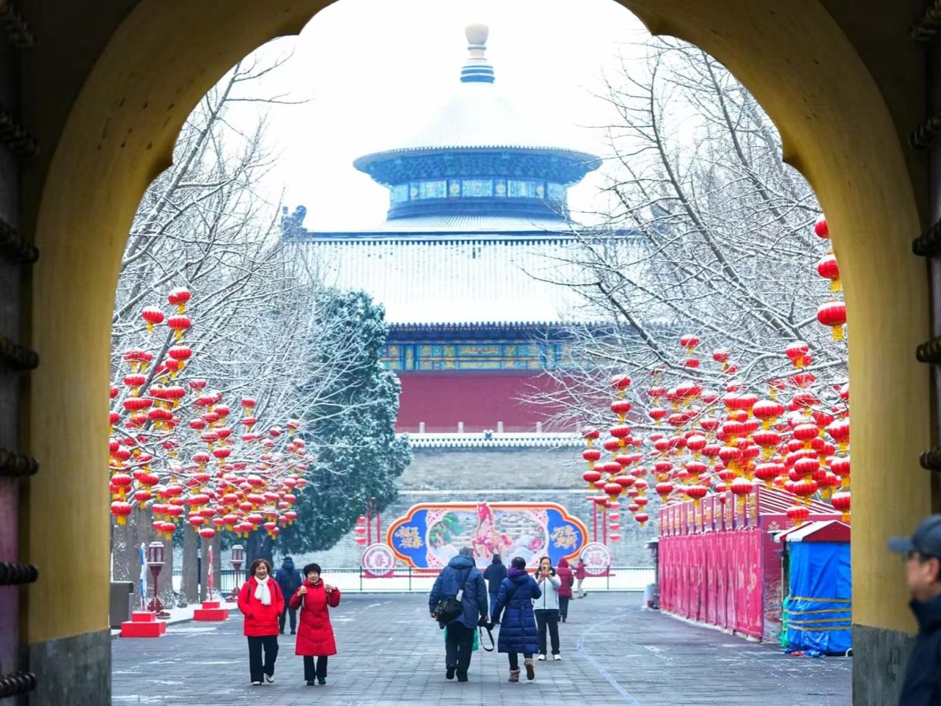 春雪落京城,天坛“福马迎春”装饰别有一番韵味