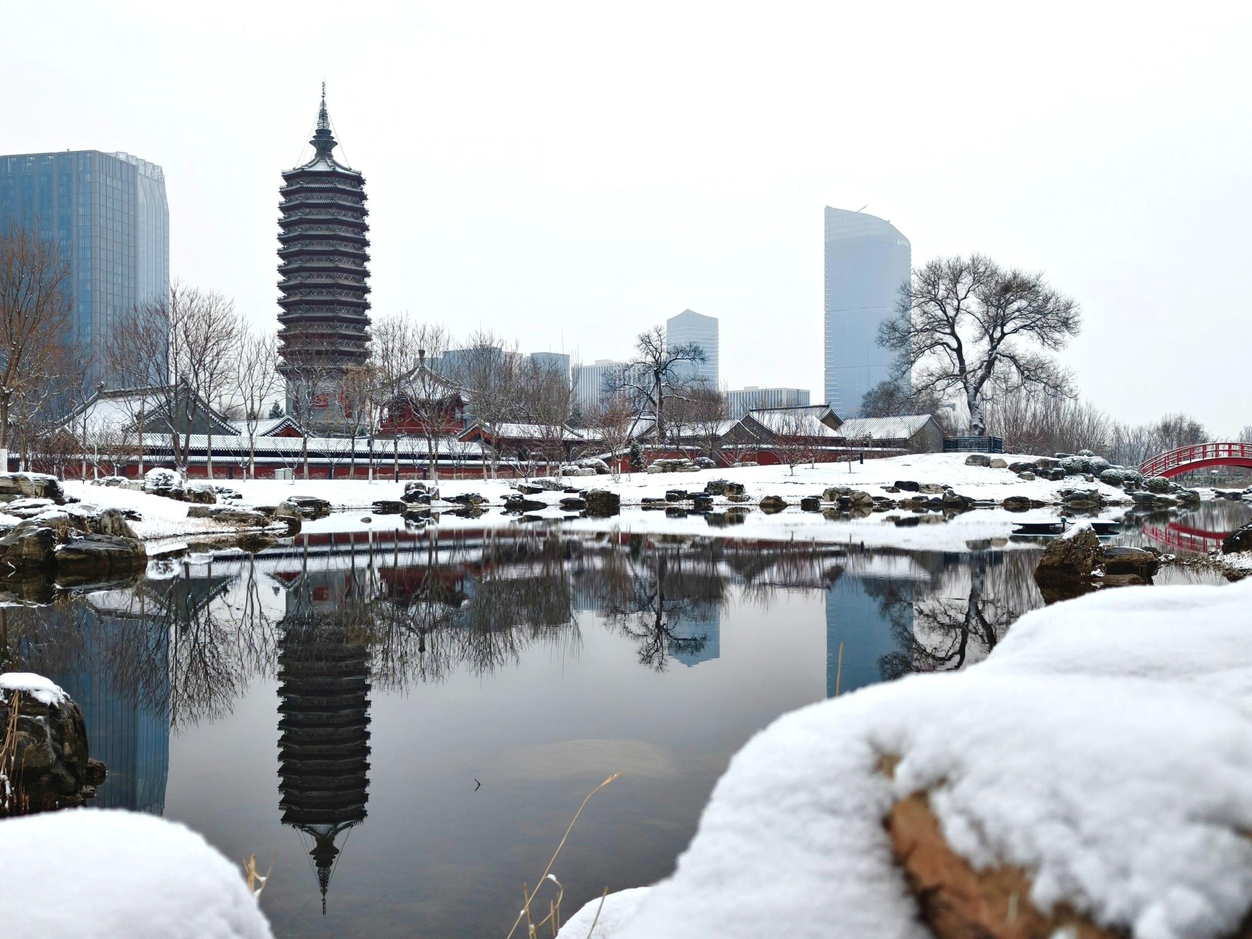 春雪“轻吻”古塔,通州大运河畔尽显北国风光