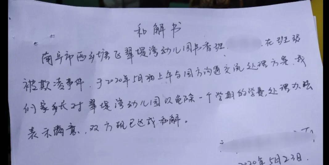 在监控视频中可以看到,去年1月,何女士女儿就遭到同桌男孩的挥拳、推搡和拍打,而老师就在教室里走动,并没有制止。何女士查看监控后, 立即找了幼儿园的老师反映问题,但是老师说这是正常现象,就是小孩子打闹,便不再多管这件事。何女士认为,女儿长期被打,身体和心理上都受到损伤。她继续找幼儿园协商解决,但因为疫情,幼儿园一直不开门。去年5月23日,经过教育部门协调,何女士一家和园方协商,签订了一份和解协议,协议上明确幼儿园退还一个学期的学费6900元人民币。但何女士说,还有一件事,园方没有兑现。